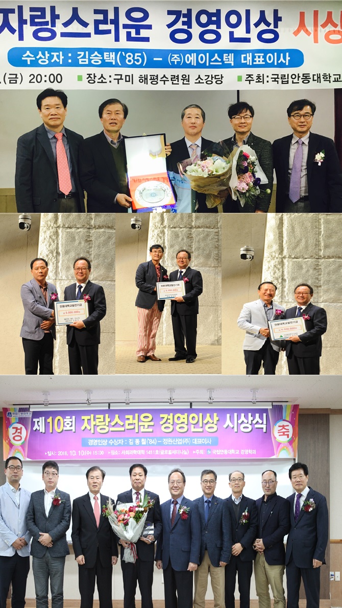국립경국대 경영학과에서는 2012년도부터 졸업생 중 지역경제 활성화에 이바지하는 경영인을 추천받아 “자랑스러운 경영인상”을 수여합니다.