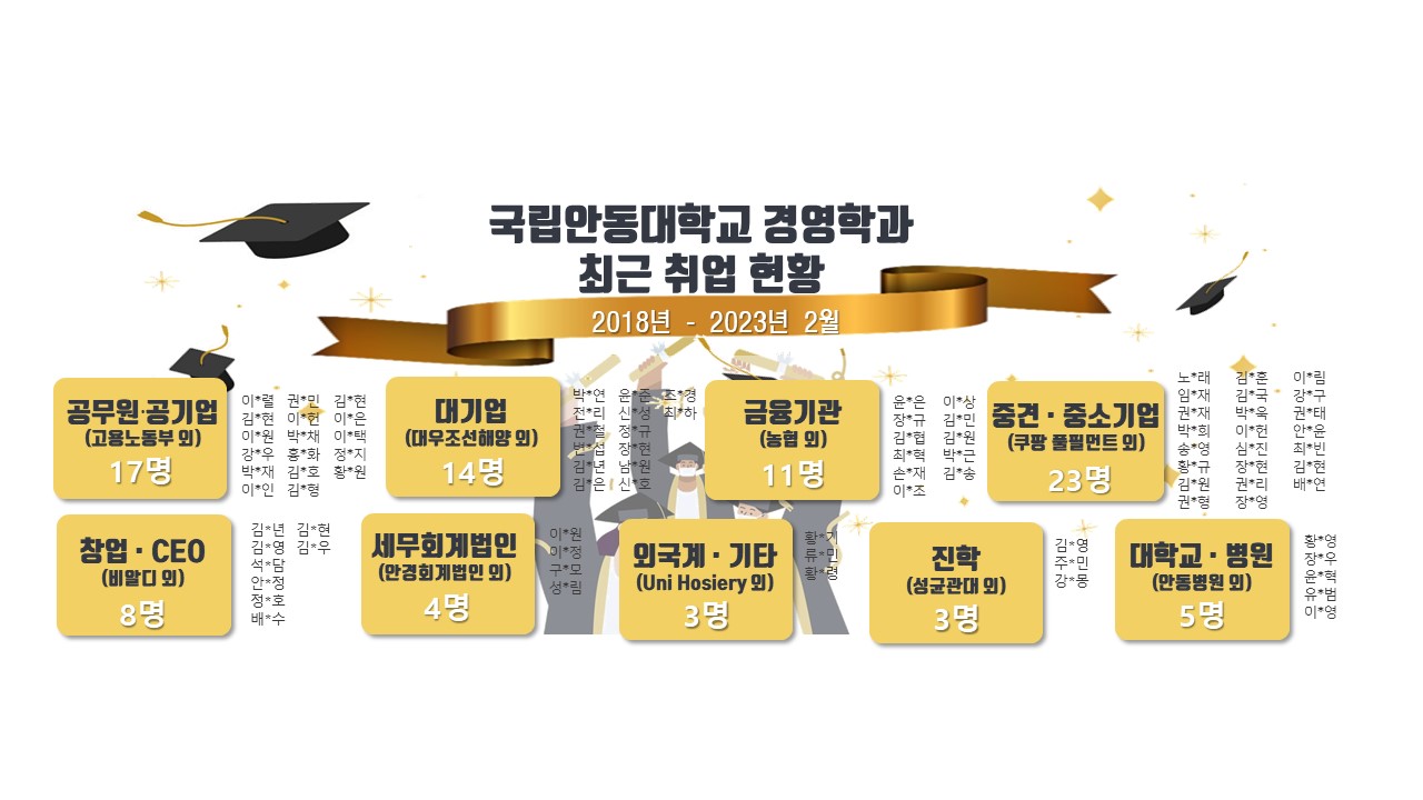 | 공공기관 42명 | 중소기업진흥공단 81학번 김*현 / 한국감정원 81학번 이*경 / 한국수자원공사 81학번 조*대 건강보험심사평가원 07학번 이*환 / 근로복지공단 11학번 박*진 |